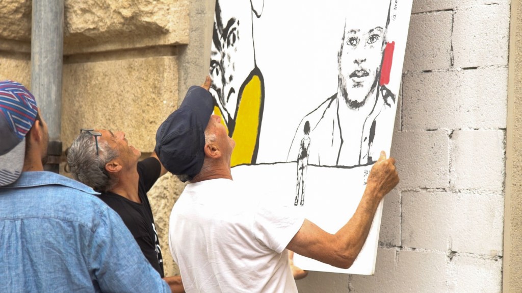 Accrochage des œuvres réalisées pendant 2 jours à 22 mains sur les fenêtres murées de la gare de Saint-Dalmas